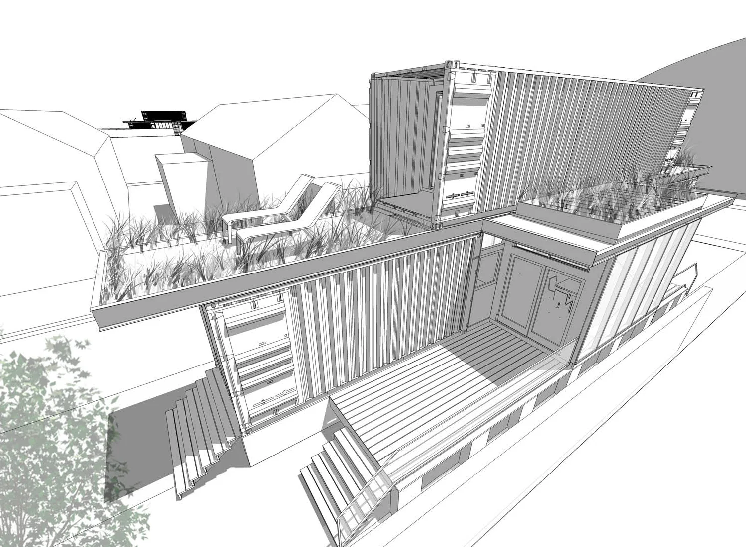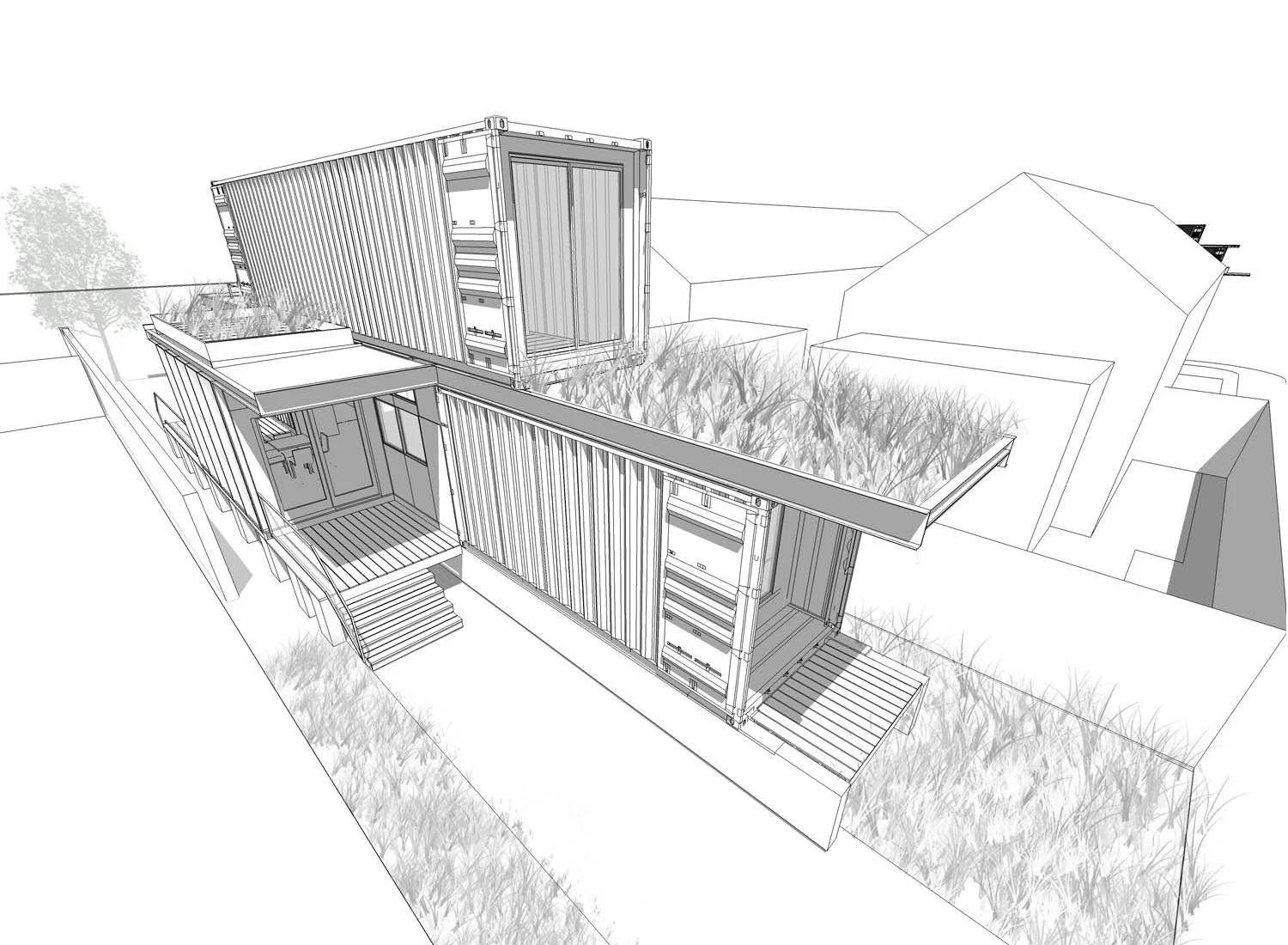 this residence was designed for a landscape architect client in response to a growing interest in repurposing shipping containers. in this scheme, three standard length metal containers are arranged in a composition that defines a variety of rooftop and lower-level deck and garden spaces. while containers can function well for one to two people at a time, they do not tend to serve as well for communal activities. thus, the predetermined size of the containers led to the location of more intimate, private spaces within the container volumes and necessitated design of a larger, more public living space enclosed within a translucent cladding system.